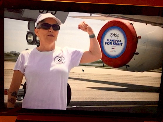 Orbis, with their flying eye hospital has an annual fund raiser involving teams pulling a giant cargo plane. The Checkered Eye Project educates about the blindness spectrum and the wearable symbol for partial blindness, the checkered eye. Both need public awareness so checkered eye creator Libby Thaw plans to single handedly pull the 60-ton jet to raise funds and understanding.
