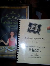 Naturally when my hubby and I went for a bite and a beer at Jack Astor's, I asked if they have a large print version of their menu. Expecting the usual response, I was surprised, as was our waitress, to learn that they did in fact have an accessible version which had both large print and Braille. Super!