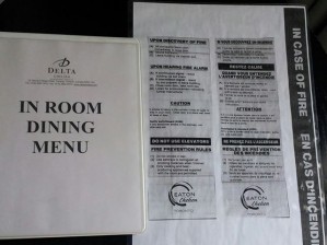 So on my trip I was delighted with accessible literature in a couple instances. First, at the Delta Chelsea Hotel, where I requested accessible literature when I made my reservation, I was very happy to find a large print version of their room service menu and emergency procedures, and a phone with an oversized keypad. I've been asking for these accommodations for years and this is the second time they've ever been succesfully provided.